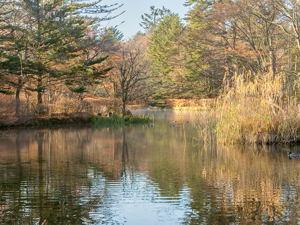 やがて雲場池に着くと、紅葉の名残はすっかり姿をひそめ、冬枯れの景色へと装いを変えています。