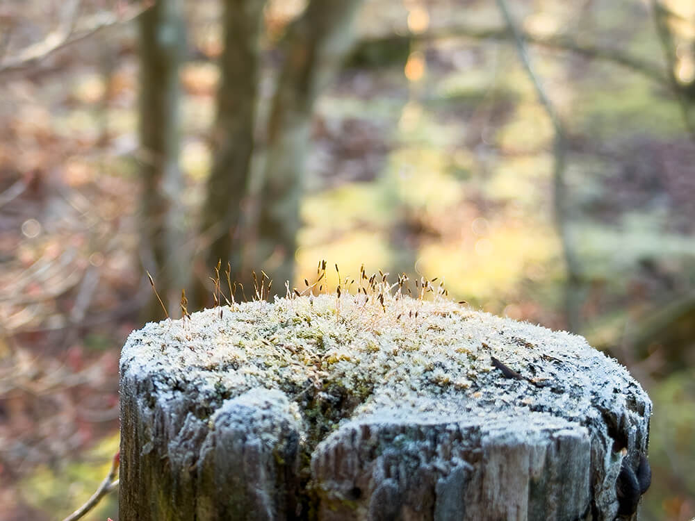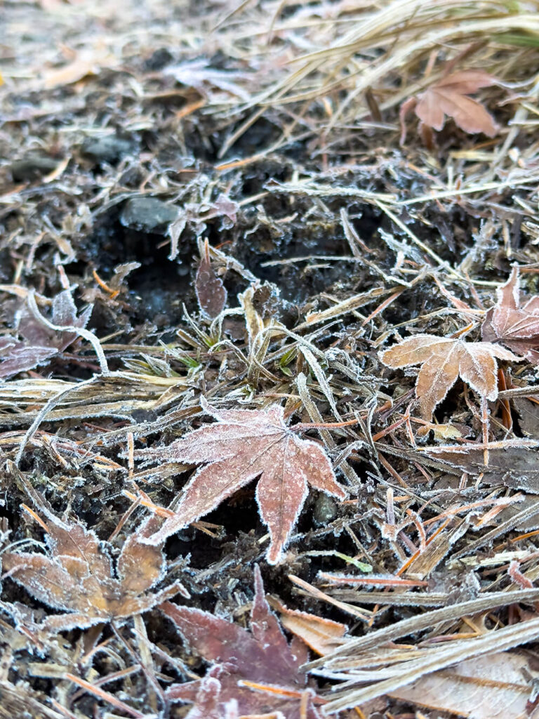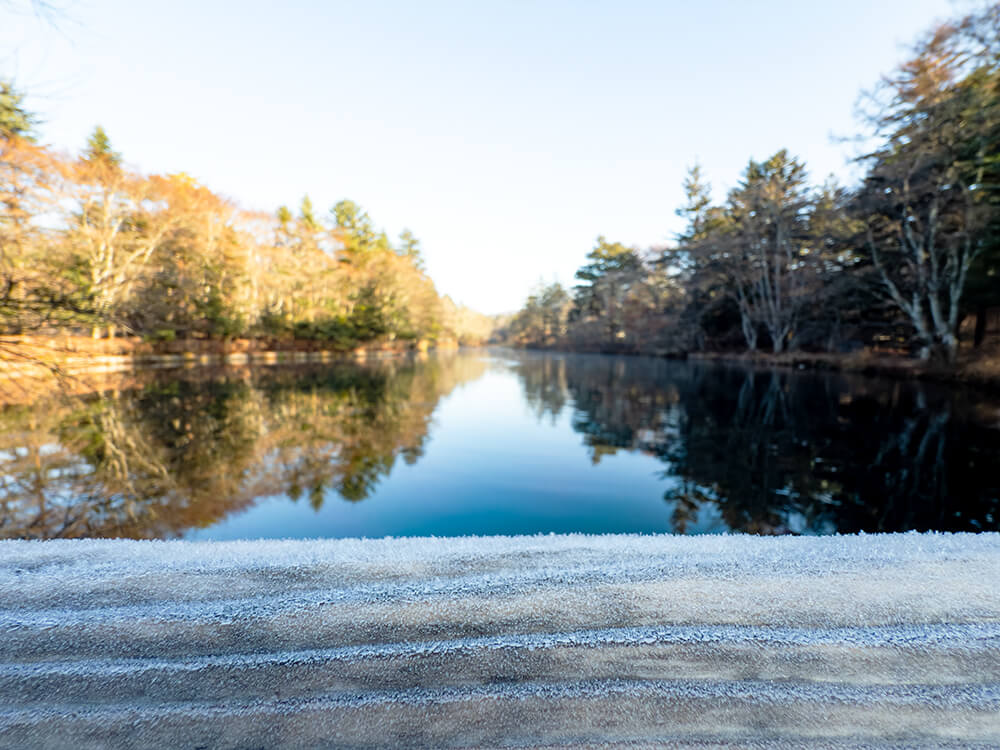 池のほとりにある木製のフェンスや杭の上。そこに生えている小さなコケにさえ、朝霜が細やかに縁取り、キラキラと光っていました。足元を見ると、落ち葉の上にも白いお化粧がされていて、霜柱ももうちゃんと生えているんです。