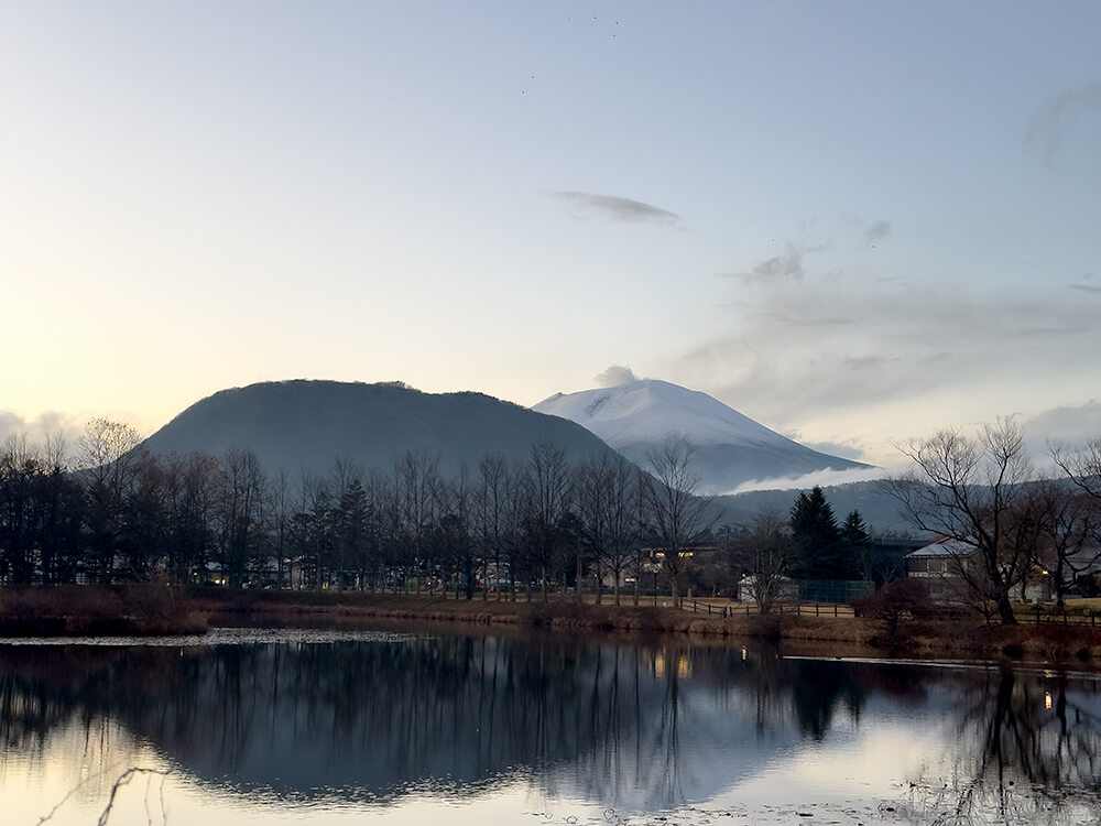 頭に積もった雪とくゆる煙。山肌から立ち上る白いもやが、まるで静かな幻想を見せてくれているみたいで、とても綺麗でした。