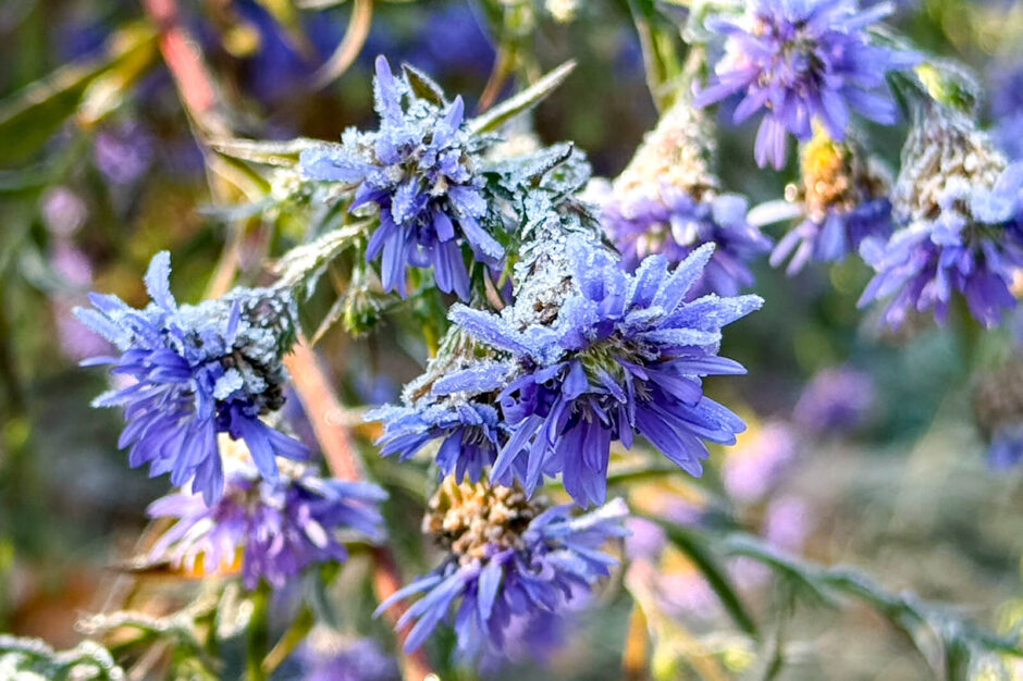 歩き始めると、庭先で小さな紫色の花が霜をまとっていて、思わず足が止まりました。