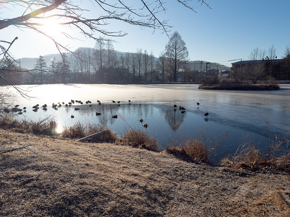 矢ヶ崎公園の池には氷が張って、霜が朝日にキラキラ。