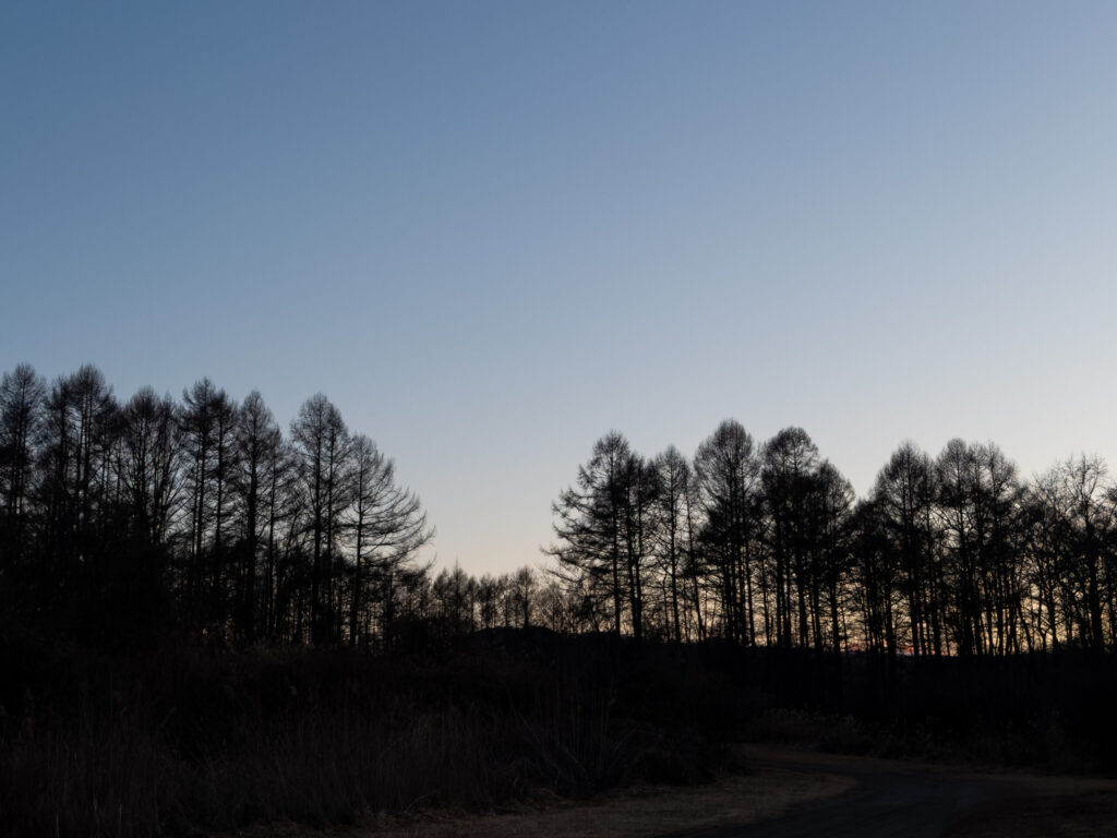 ここ数日は、粉雪が少し残る散歩道を歩いたり、夕方の雲場池に映る空を眺めたり、カラマツの枝の間から見える夕空に足を止めたりも。