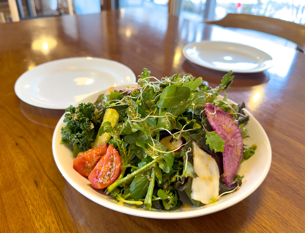 瑞々しくてハリのある野菜に、自家製のドレッシングがよく合います。隣町の農家さんが、真冬でもビニールハウスを薪で温めながら育てている野菜なのだそうですよ。