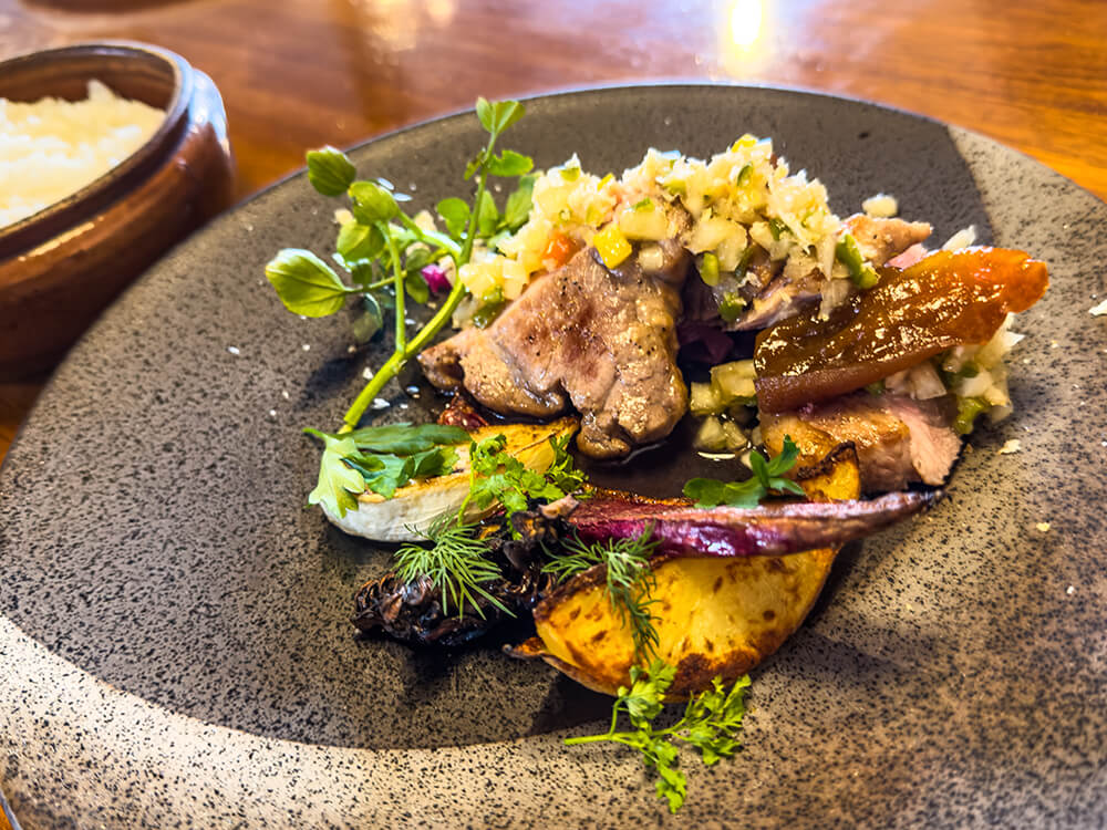 特に印象に残ったのが、お肉に添えられていた干し柿のコンポート。 まろやかな甘みと、ふわっと香るワインの風味が、お肉と合わさって驚くほどおいしくて。