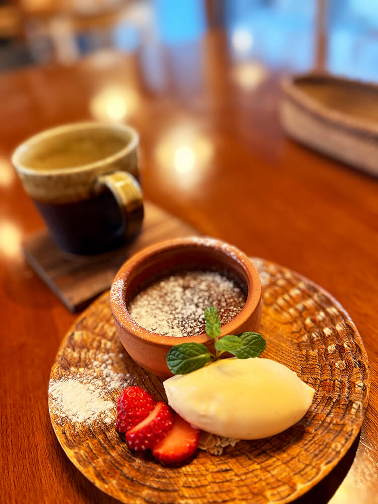 表面のパリパリとしたキャラメルを割りながら、ほろ苦くてクリーミーなチョコレートのブリュレをバニラビーンズたっぷりのアイスと共に味わいます。