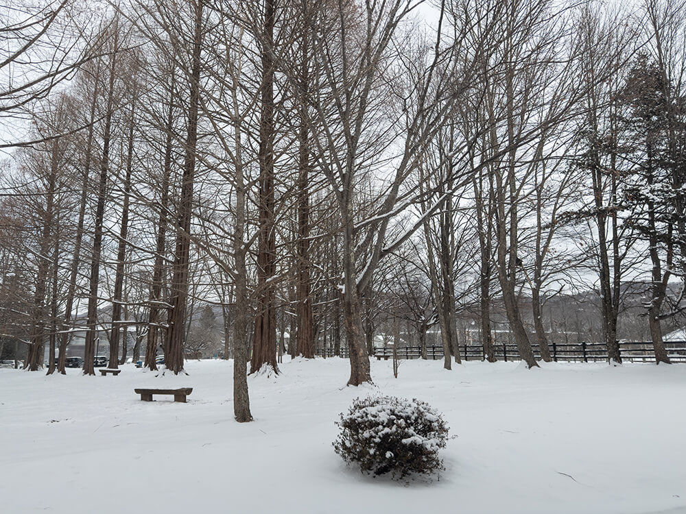 軽井沢らしい、サラサラと乾いた白い粉雪。雪が積もっているのに、どこか「乾いた」不思議なこの空気感。軽井沢の冬だなって感じます。