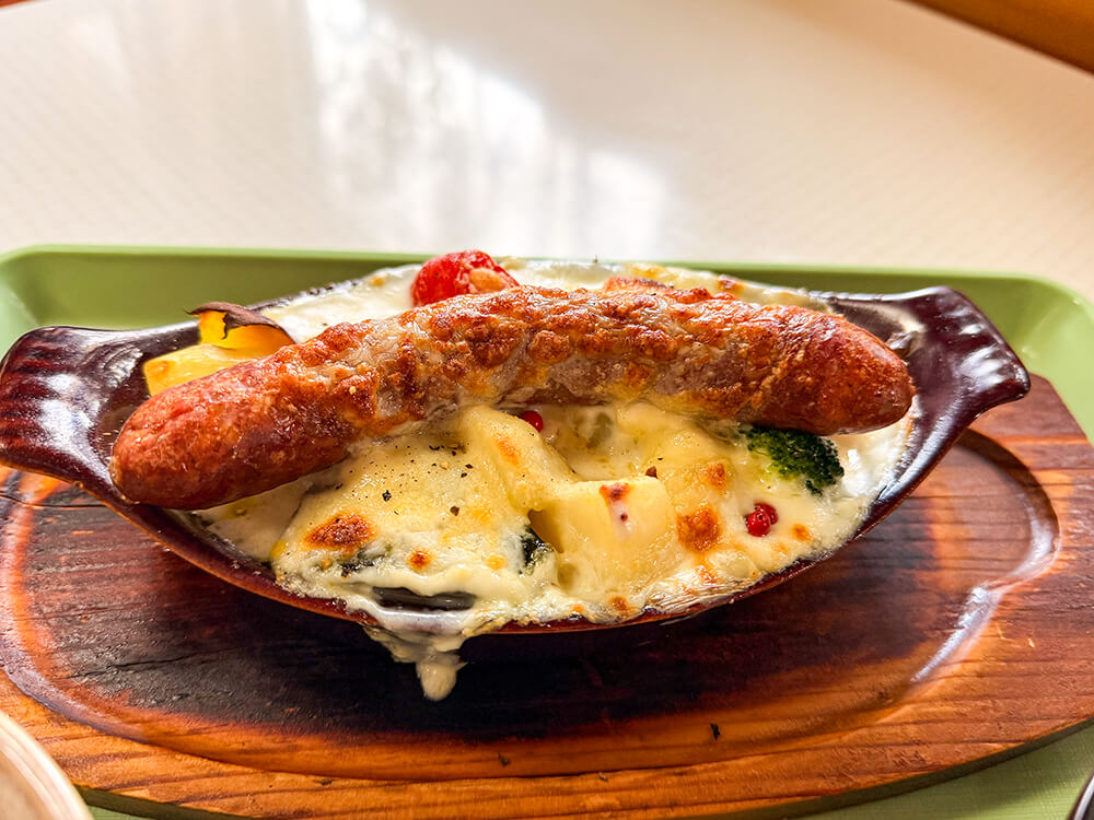 運ばれてきた熱々のグラタンには、大きなソーセージが真ん中にドンと乗っていて、ポテトやカボチャがゴロロロ。