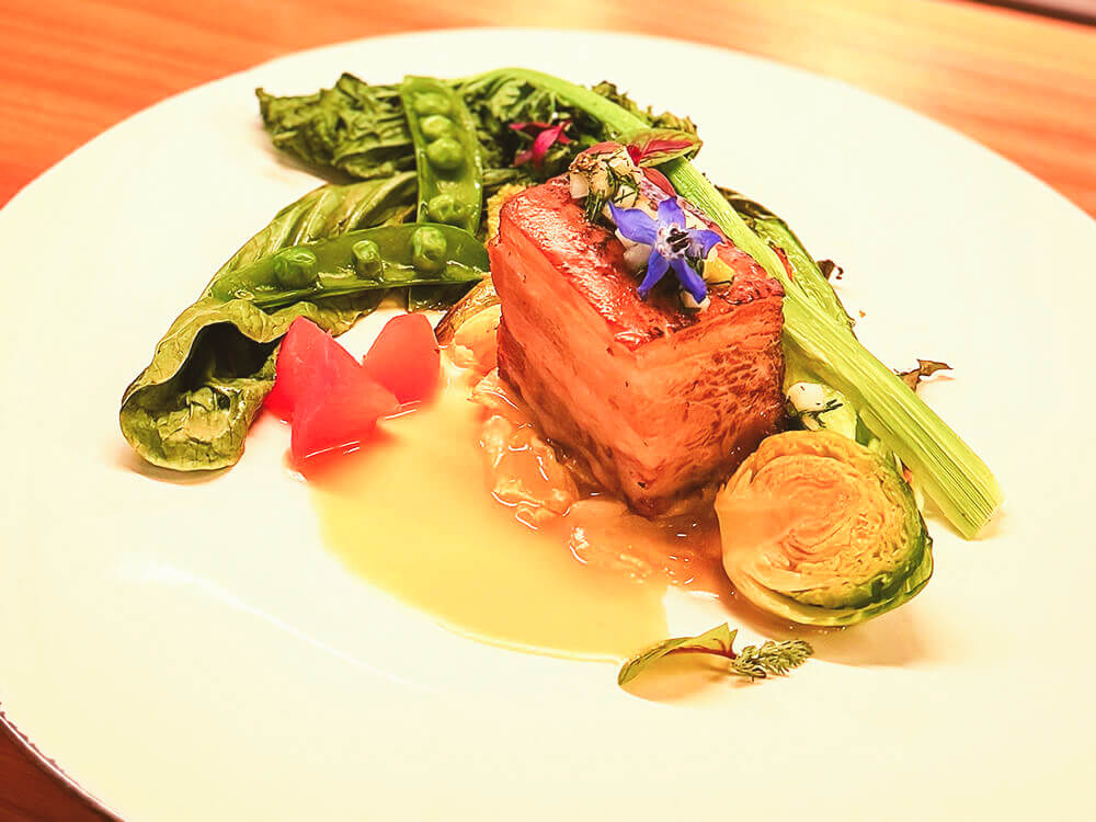 シードルの香りとお味噌のコクをそっと纏ったアグー豚の旨みは、口の中で濃厚なバターがとろけていくような感覚。