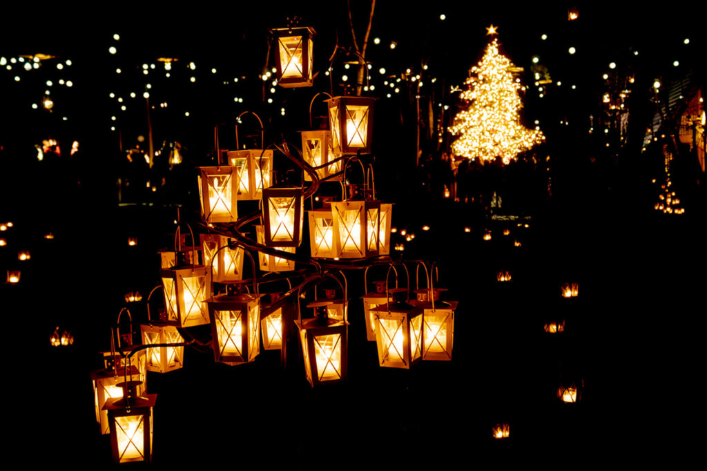 無数のランタンと大きなクリスマスツリーの輝き。まるで物語の世界に迷い込んだような温かな感動に包まれます。