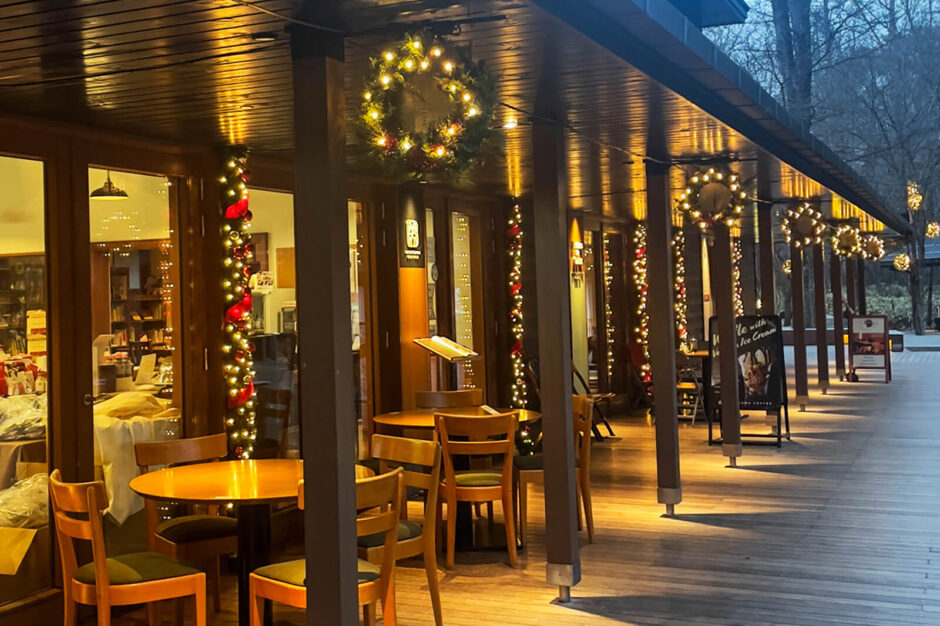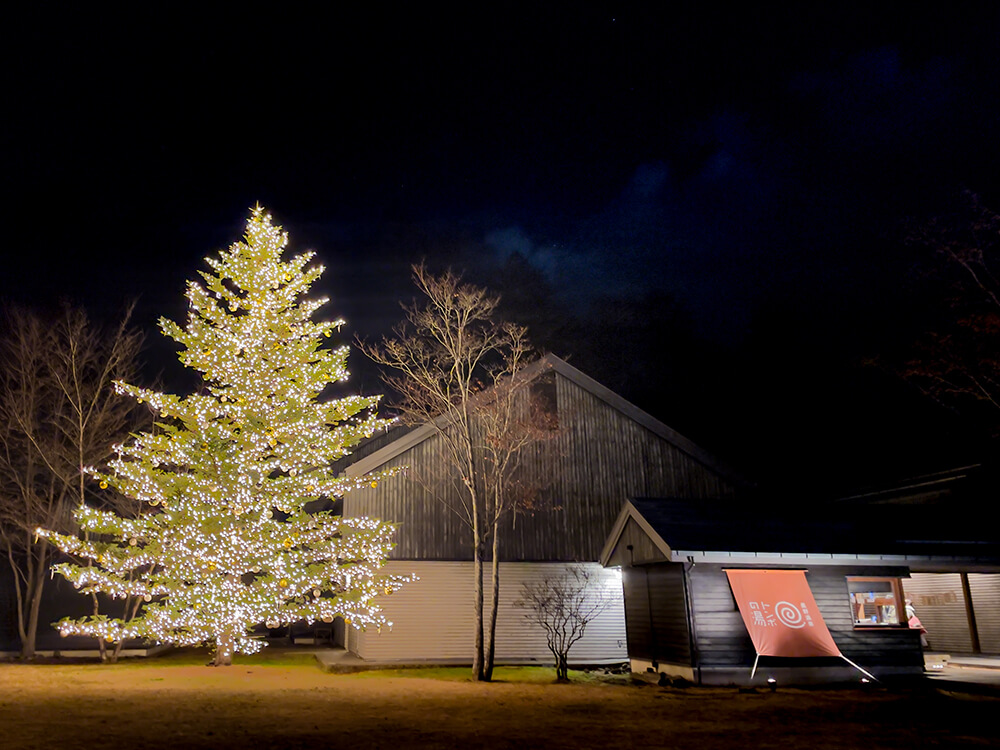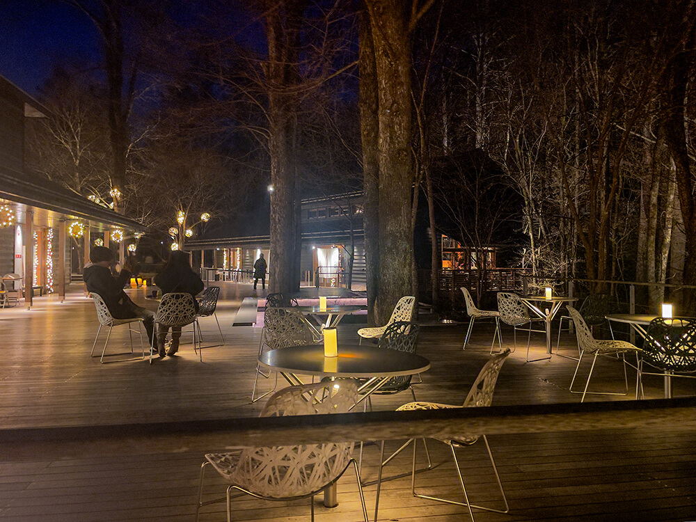 同じ星野エリアにあるハルニレテラスでも、あたたかみのある灯りの中でカフェや散策を楽しめます。