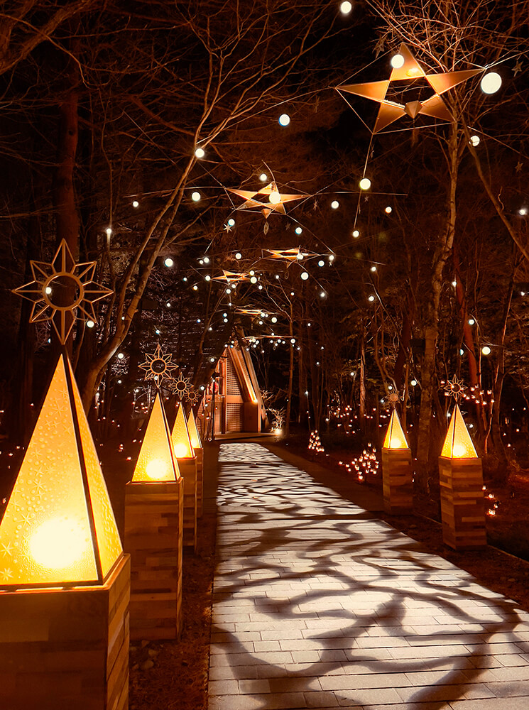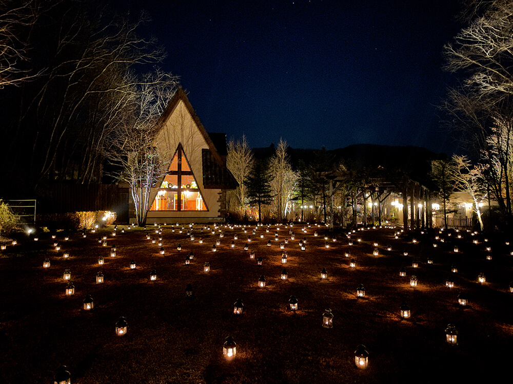 標高の高い南軽井沢の静かな森に佇む教会が、数え切れないほどのキャンドルに彩られます。